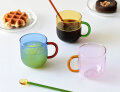 淡い色合いのカップに色違いのハンドルがついた、2トーンカラーのデザインが可愛らしい、Two Color 耐熱ガラスマグ。