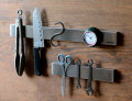 磁石が内臓されたステンレスプレートで鉄製品をピタッと収納ができるツールホルダー。キッチンでは包丁やピーラーなど、リビングでは鍵や工具類などと、普段よく使うアイテムの収納に便利です。